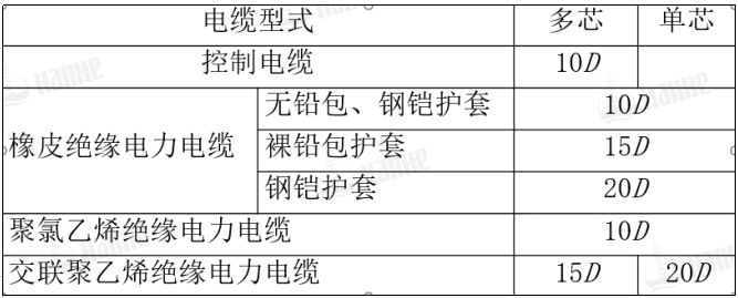 4.3敷設(shè)前檢查線路路徑,避免因路徑彎曲半徑過(guò)小造成護(hù)套開(kāi)裂,XLPE絕緣電纜彎曲半徑不能小于電纜直徑的15倍(具體見(jiàn)下表)。