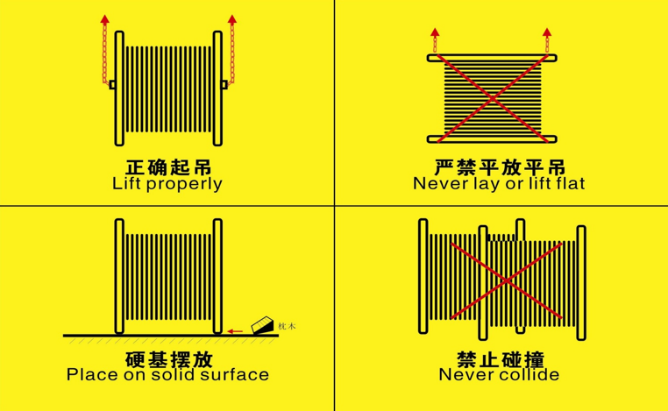 1)嚴(yán)禁將電纜盤(pán)水平搬運(yùn)或水平儲(chǔ)存,更不允許電纜盤(pán)平放敷設(shè)。